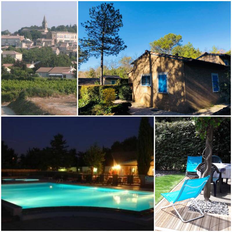 Mazet climatisé 5-6 personnes dans une petite résidence de vacances avec piscine commune, jardin et terrasse ombragée ainsi qu'une pizzéria en saison (04-09)